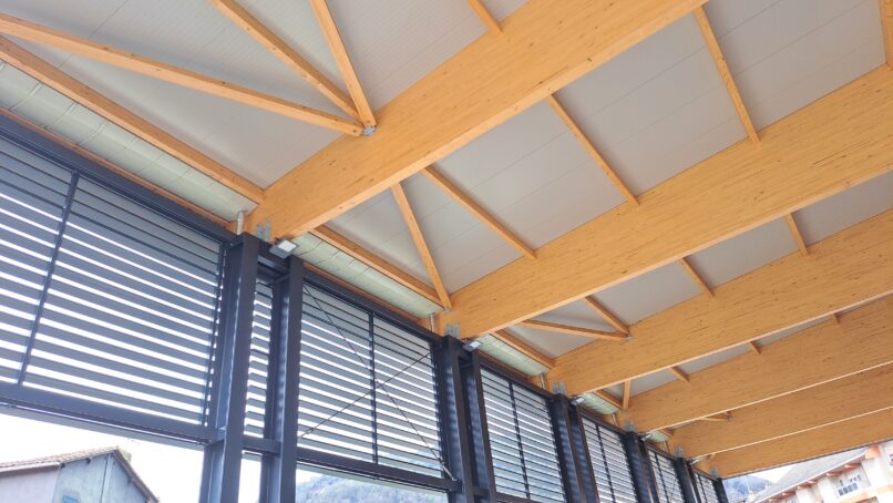 Se trata de una estructura de vigas y correas de madera laminada apoyadas en soportes metálicos.