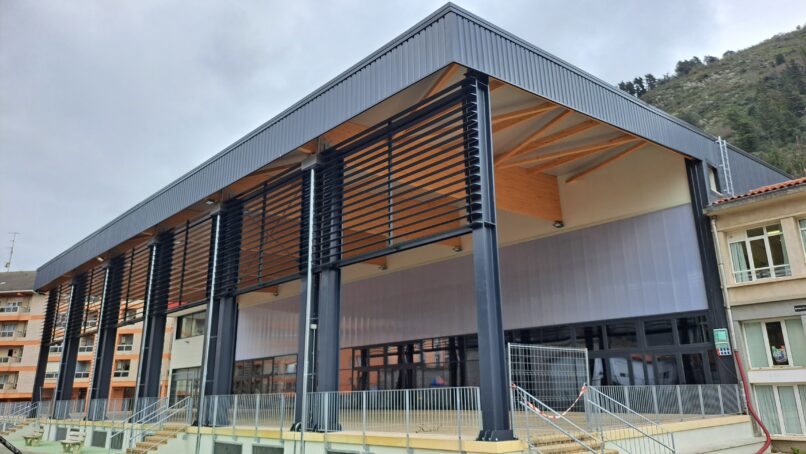 La nueva geometría consiste en una cubierta de un único plano de unos 36 metros de luz. Así se evita el apoyo en las vigas intermedias de la cancha polideportiva situada en el semisótano. Además, se permite la instalación de paneles solares en todo su desarrollo.