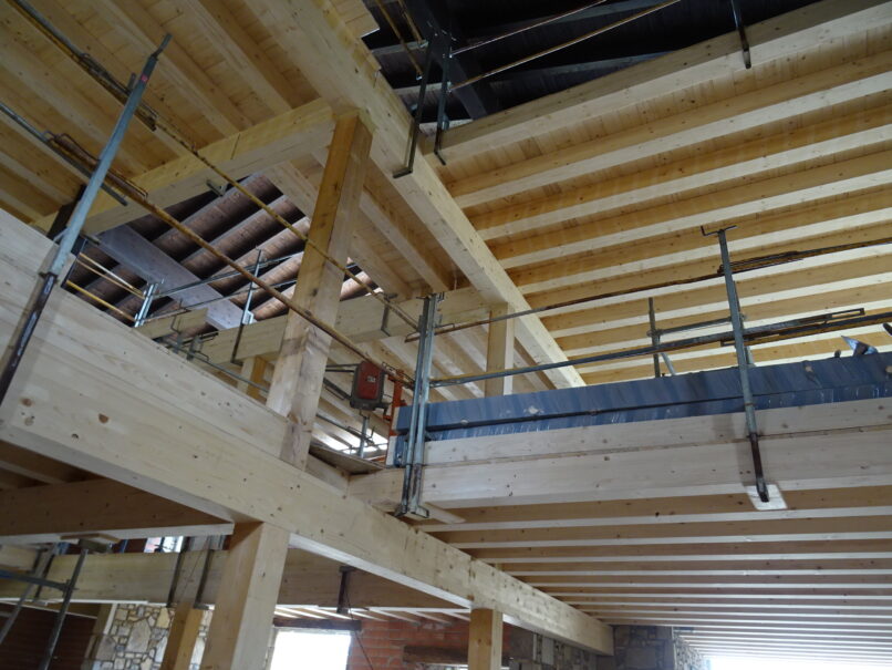 Estructura de muros portantes de mampostería de piedra, pilares, pórticos, forjados y estructura de cubierta de madera.